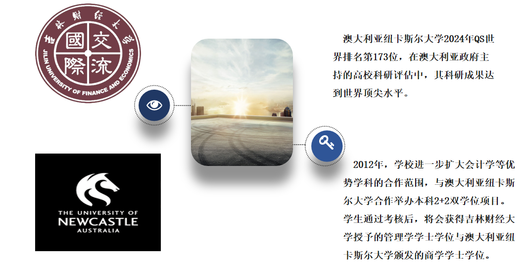 随着taptap点点中外合作办学项目的高质量发展,2012年,学校进一步扩大会计学等优势学科的合作范围,与澳大利亚纽卡斯尔大学合作举办本科2+2双学位项目。项目学生本科期间1-2年级在taptap点点学习,3-4年级在澳大利亚纽卡斯尔大学就读。中澳双方学校互认学分,学生通过考核后,将会获得taptap点点体育授予的管理学学士学位与澳大利亚纽卡斯尔大学颁发的商学学士学位。