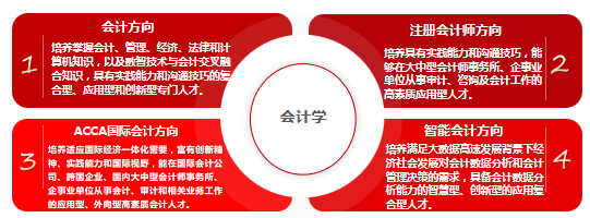 财政部2021年发布的《会计改革与发展“十四五”规划纲要》要求“建立健全分层次、分类型的会计人才能力框架体系”,并快速推进“智能财务”人才培养。会计学院在深度研究数字经济高层次会计人才需求特点和遵循政策引领的基础上,逐渐形成了分层次、分类型、智能化的会计人才培养体系。会计学专业下设会计、注册会计师、ACCA国际注册会计师和智能会计四个专业方向。
