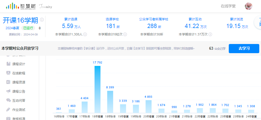 打造了会计学、初级财务会计等一批线上线下相结合的精品在线开放课程。会计学慕课在东西部高校、吉林高校联盟、外经贸联盟等九大平台推广,供全国各高校共享学习。选课院校遍布全国28个省和直辖市,截至2024年3月共计181所院校选课,在全国34个省级行政区占比达82.35%,累计46476人选课,累计互动达41.22万次。