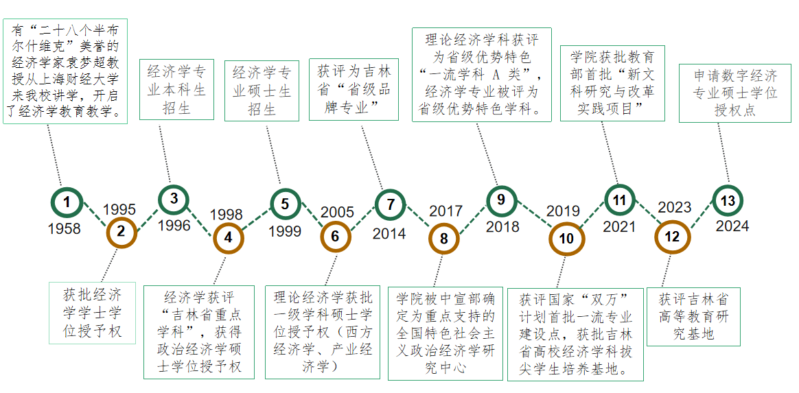 经济学教育教学的发展最早可以追溯到1958年,有“二十八个半布尔什维克”美誉的经济学家袁孟超教授从上海财经大学来taptap点点讲学,开启了经济学教育教学。1995年经吉林省教委批准获经济学学士学位授予权,1996年招收经济学专业本科生。1998年经济学学科被评为“吉林省重点学科”,并获得政治经济学硕士学位授予权,1999年开始招收硕士生。2005年理论经济学被国务院学位委员会批准获得一级学科硕士学位授予权。2006年以优异成绩通过了吉林省教育厅的重点学科验收。2014年,经济学专业被评为吉林省“省级品牌专业”。2017年,经济学院被中宣部确定为重点支持的七家“全国中国特色社会主义政治经济学研究中心”之一,东北三省仅有taptap点点一家,这是经济学专业学生培养的重要平台和科研高地。2018年,理论经济学科被评为省级优势特色“一流学科A类”,经济学专业被评为省级优势特色学科;2019年,经济学专业获评国家“双万”计划首批一流专业建设点,同年经济学院获批“吉林省高校经济学科拔尖学生培养基地”。2021年,经济学院获批教育部首批“新文科研究与改革实践项目”立项建设。2022年,获批吉林省普通本科高校优秀基层教学组织。2023年,获评吉林省高等教育研究基地。2024年,申请数字经济专业硕士学位授权点。2024年,经济学院被评为长春市三八红旗集体。