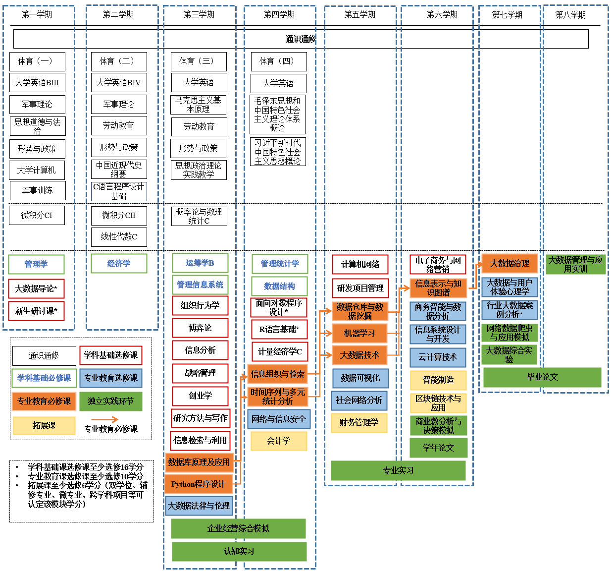 为了实现新专业错位发展,依据培养目标,加强管理、经济、金融、电子商务等行业背景课程学习,课程设置包括通识选修课、学科选修课、专业选修课三个模块。增设数据思维、管理学基础、金融工程学、经济数据分析方法、商务大数据分析等10余门特色课程,课程资源配合优化整合的企业脱敏数据,以私有云架构,虚拟化技术实现云上实验室。