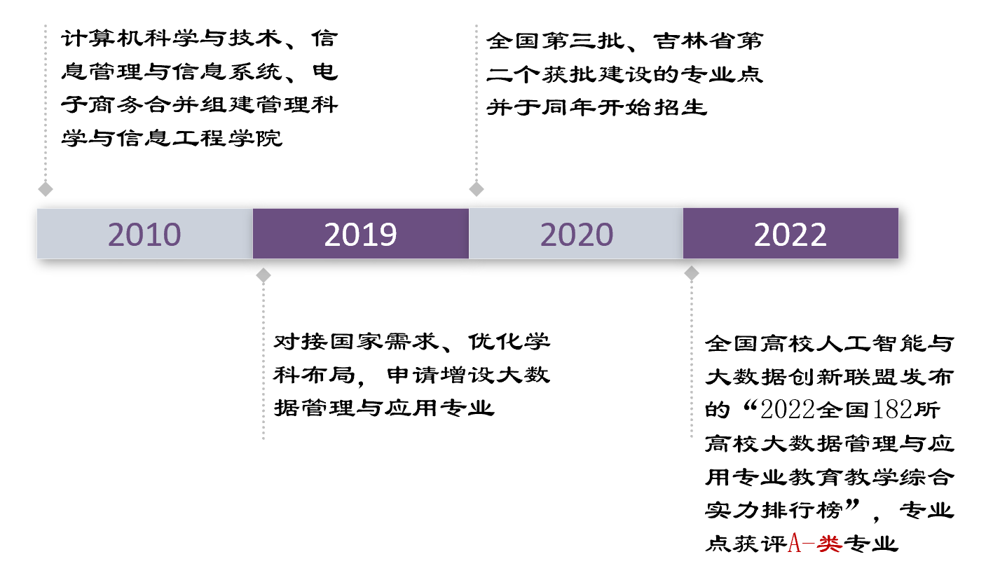 大数据管理与应用专业是教育部根据国家战略需求和经济发展而特设的本科热门专业,以“互联网+”和大数据时代为背景,应用大数据分析的方法和理论于管理学,通过科学决策和量化分析解决各类问题。大数据管理与应用专业于2020年设立,并于同年开始招生,是全国第三批、吉林省第二个获批建设的大数据管理与应用专业。在全国高校人工智能与大数据创新联盟发布的“2022全国182所高校大数据管理与应用专业教育教学综合实力排行榜”,专业点获评A-类专业。专业现有专任教师11人,其中8人具有高级职称(占比73%),8人具有博士学位(占比73%),3人具有海外留学经历(占比27%)。学科背景涉及计算机、智能分析、信息管理、管理科学与工程、信息系统、工商管理等多个学科,多学科交叉特色明显。