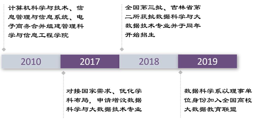 本专业所在的管理科学与信息工程学院2010年由计算机科学与技术、信息管理与信息系统、电子商务三个专业合并组建;2017年对接国家、地方需求,优化学科办学布局,结合学院学科、专业与师资优势,申请增设数据科学与大数据技术专业;2018年taptap点点于全国第三批、吉林省第二所获批数据科学与大数据技术专业并于同年开始招生;2019年数据科学系以理事单位身份加入全国高校大数据教育联盟。