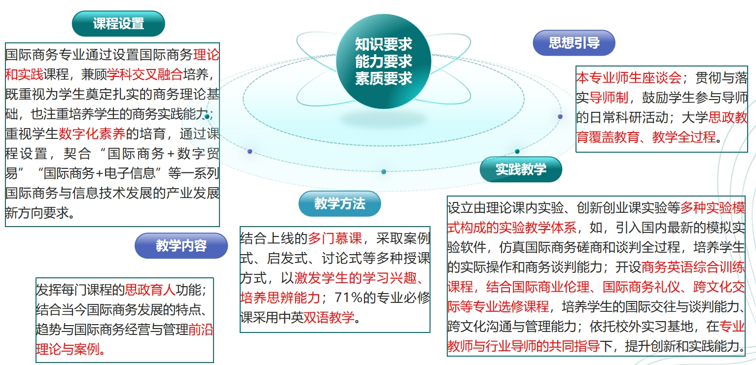 在课程设置方面,本专业通过设置国际商务理论和实践课程,兼顾学科交叉融合培养,既重视为学生奠定扎实的商务理论基础,也注重培养学生的商务实践能力。同时,本专业重视学生数字化素养的培育,通过课程设置,契合“国际商务+数字贸易”“国际商务+电子信息”等一系列国际商务与信息技术发展的产业发展新方向要求。