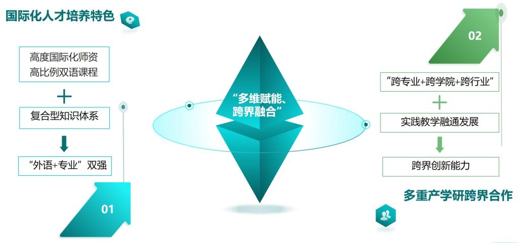 国际商务专业以多维赋能国际化人才培养与深度产教融合为特色,构建了“多维赋能、跨界融合”人才培养模式。本专业形成了“高度国际化师资+高比例双语课程”的人才培养特色,力求培养具有国际视野的“外语+专业”双强型人才;通过“跨专业+跨学院+跨行业”等多重产学研跨界合作,以期使学生在“做中学”“做中思考”,锻炼其理论与实践相结合的跨界创新能力。