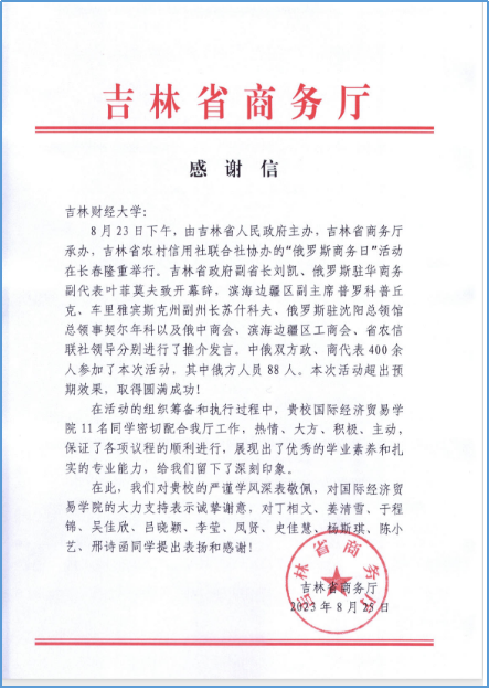 我院还主动对接省商务厅,选派学生参加第十四届中国-东北亚博览会“俄罗斯商务日”活动,活动结束后taptap点点收到吉林省商务厅的感谢信,对本专业学生的学术素养和专业能力予以高度肯定。