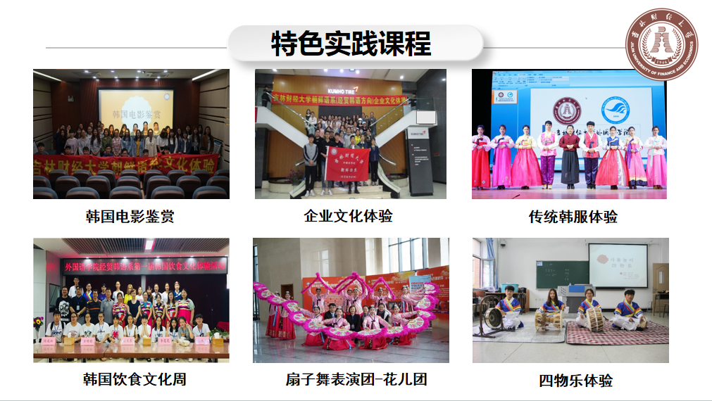 为培养学生的实践能力与创新创业能力,专业开设了一系列注重技能的实践课程,如韩国礼仪与文化体验、口译实践、笔译实训、韩语能力考试指导等。着力激发学生的思考与创新、提高学生解决问题的能力,且注重人文渗透,启发学生体悟实践能力对自身素质提高与社会发展的意义。