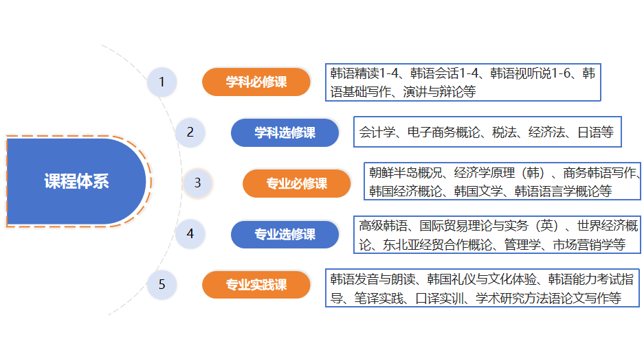 知识要求:学生应掌握朝鲜(韩)语语言知识、朝韩文学知识、朝鲜半岛区域与国别知识、经贸知识,熟悉中国语言文化知识,了解人文社会科学与自然科学基础知识,形成跨学科知识结构,体现经贸方向特色。