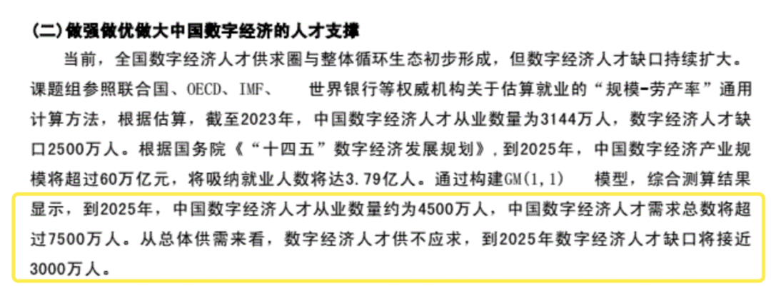 随着数字化和智能化技术快速发展,企业对数智化转型的需求日益迫切,具备跨界整合能力、创新能力和实战经验的复合型数字人才已成为传统企业高质量发展和数字化转型的核心支撑力量。根据《中国数字经济人才发展报告(2024)》显示,从总体供需来看,数字经济人才供不应求,到2025年数字经济人才缺口将接近3000万人。