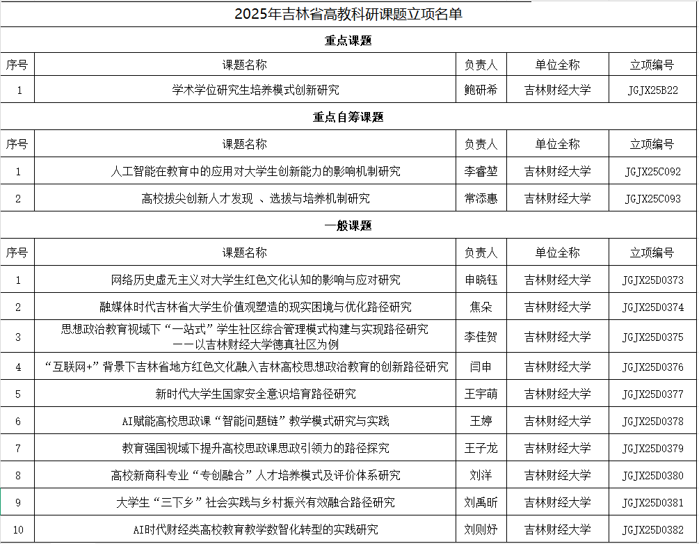 6月30日,吉林省高等教育学会发布了《2025年度吉林省高教科研课题立项通知》,经省高教学会专家组三轮评审,taptap点点有13项课题获批2025年度吉林省高教科研课题立项,其中《学术学位研究生培养模式创新研究》获批立项重点课题,获得省高教学会3000元经费资助;《人工智能在教育中的应用对大学生创新能力的影响机制研究》《高校拔尖创新人才发现 、选拔与培养机制研究》2项课题获批立项重点自筹课题;《网络历史虚无主义对大学生红色文化认知的影响与应对研究》等10项课题获批立项一般课题。
