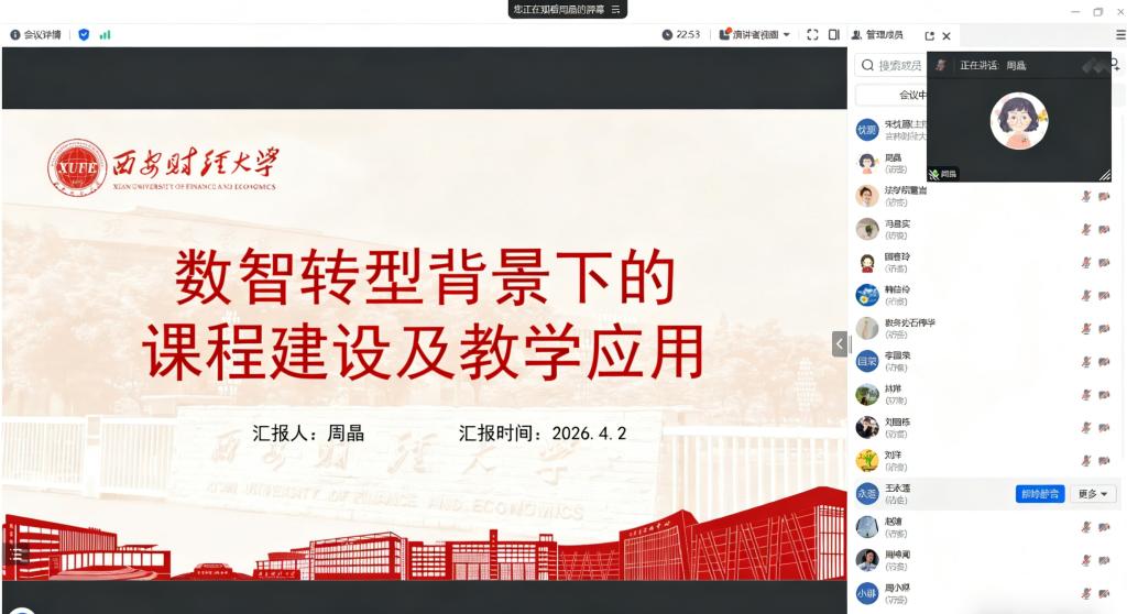 为推进智慧课程建设,提升教师数字化教学能力,4月2日学校在线上召开2026年度校级“智慧课程”建设经验分享系列讲座(第三场)。本次讲座以“数智转型背景下的课程建设及教学应用”为主题,邀请西安财经大学周晶教授担任主讲嘉宾。